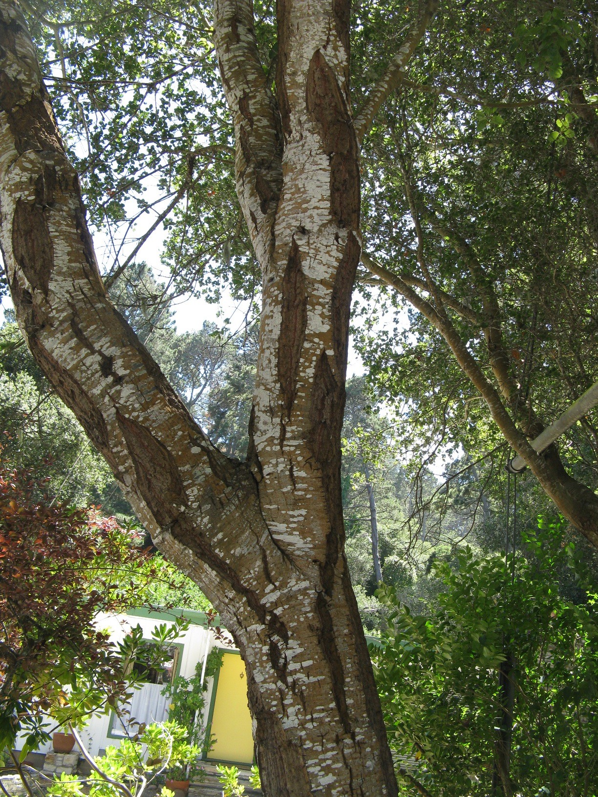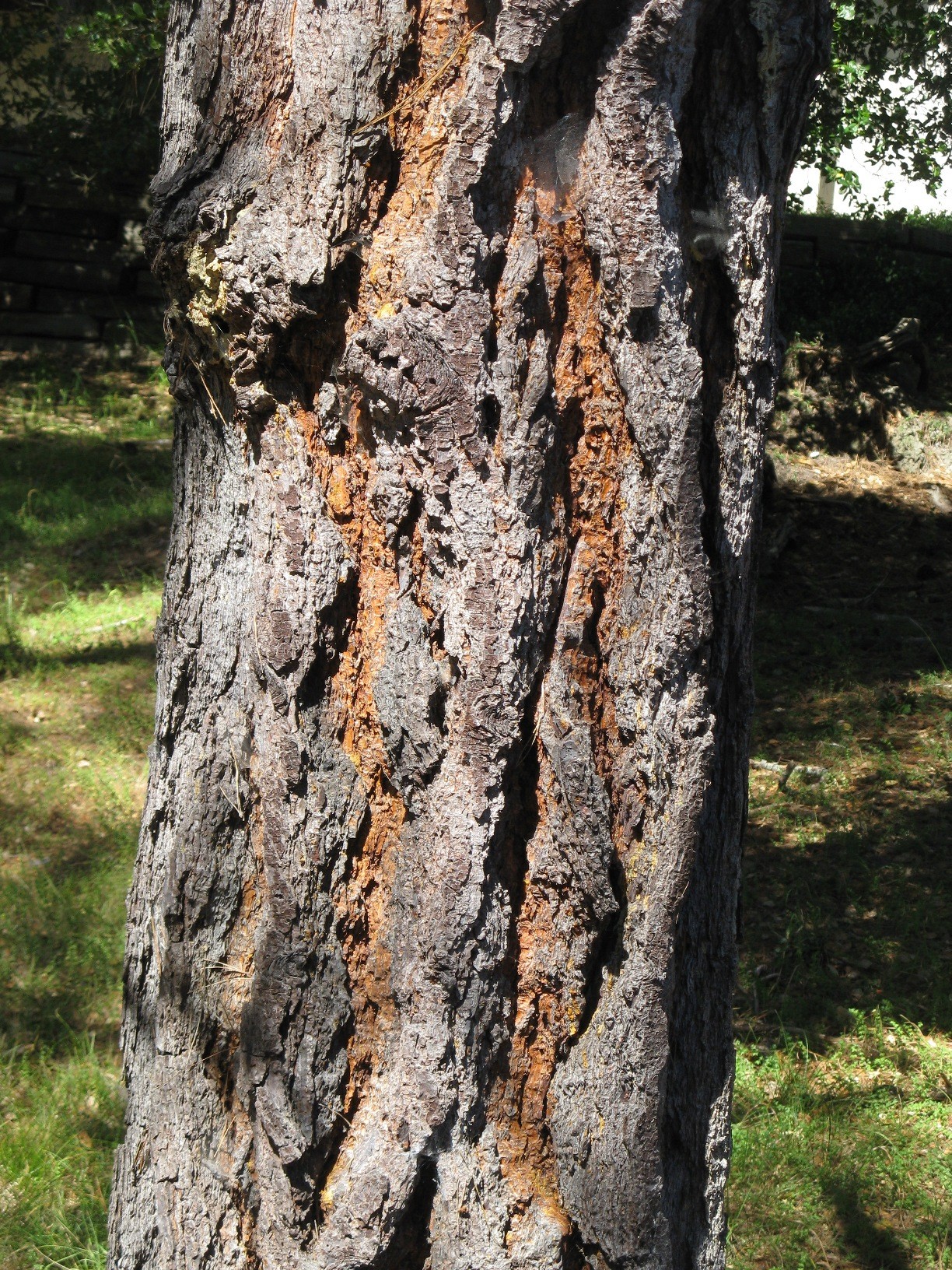 There is severe harm to the oaks and pines. The pines have deep cracks, fissures, with red showing. Some pine bark looks like it’s loose, merely sitting on the surface of the tree, ready to slough off. Some of the fissures are bleeding pitch. The oak fissures are getting deeper and broader.